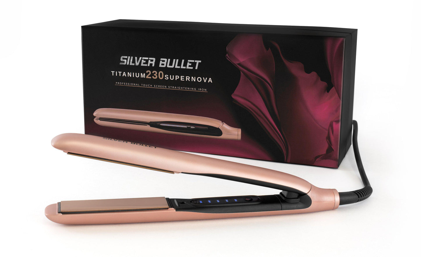 Now Silver Bullet introduces the special edition Silver Bullet Titanium 230 Supernova Hair Straightener, featuring clever touch screen on/off and temperature controls. In gorgeous rose gold, the Silver Bullet Titanium 230 Supernova creates irresistibly fast and easy results with 25mm titanium infused plates which instantly heat up to 230˚C. Hotter. Faster. Better. It’s the Silver Bullet difference.
