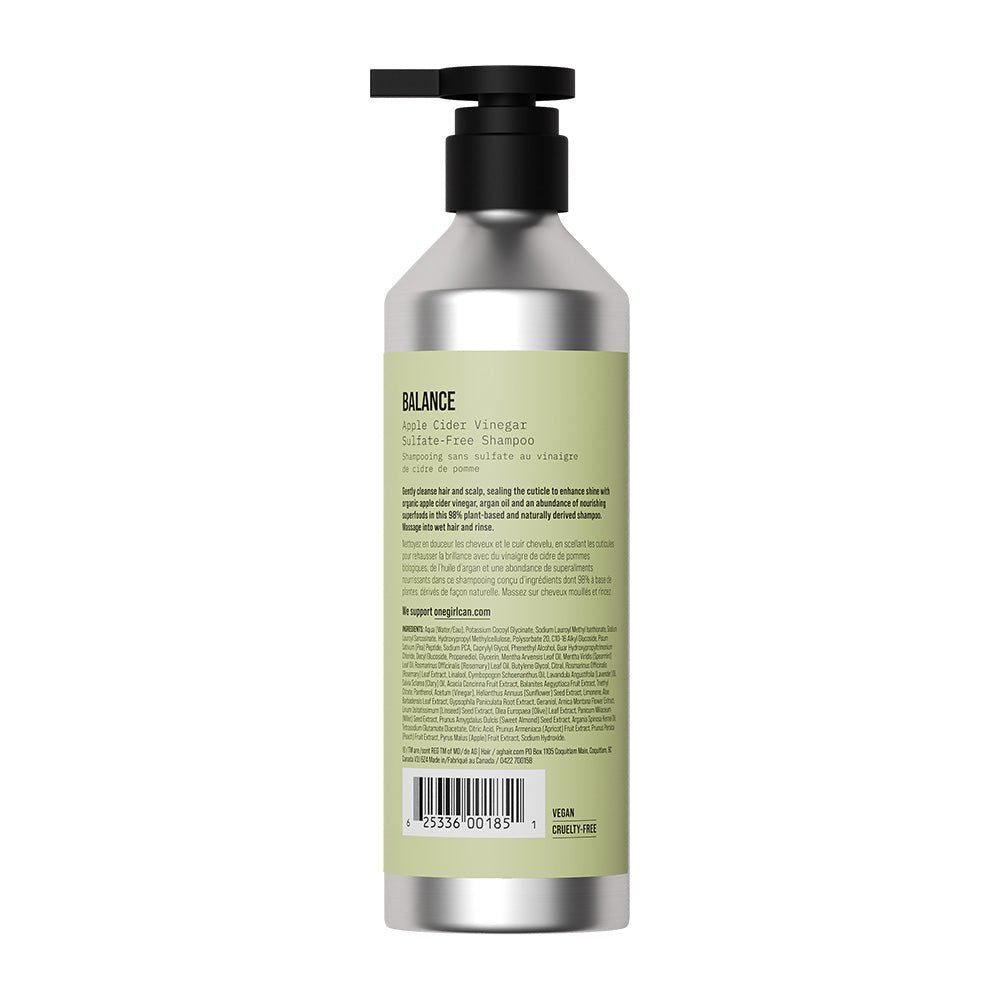 AG Care Balance Apple Cider Vinegar Sulfate-Free Shampoo 355ml gently cleanses hair and scalp, sealing the cuticle to enhance shine. Formulated with apple cider vinegar, argan oil and an abundance of nourishing superfoods this shampoo is 98% plant-based and naturally derived.