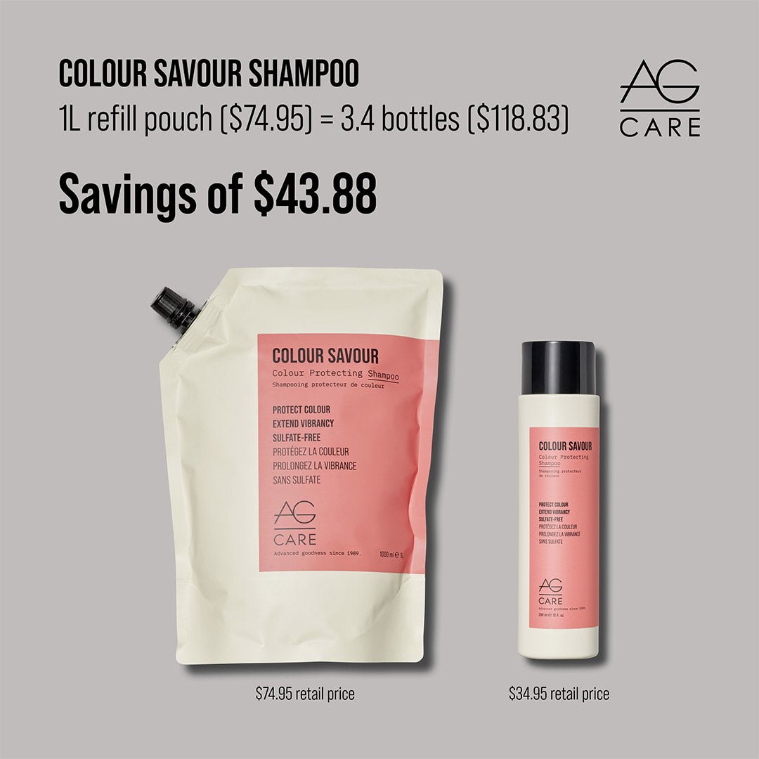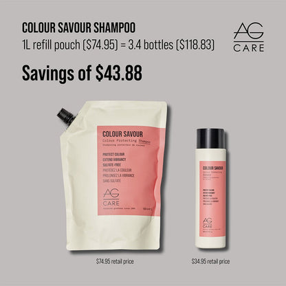AG Care Colour Savour Colour Protecting Shampoo 1L Refill Pouch gently cleanses and extends the life and vibrancy of colour-treated hair. AG Care's exclusive CARE Complex with sunflower seed extract and powerful polyphenols helps protect hair colour from UV/free radical damage.