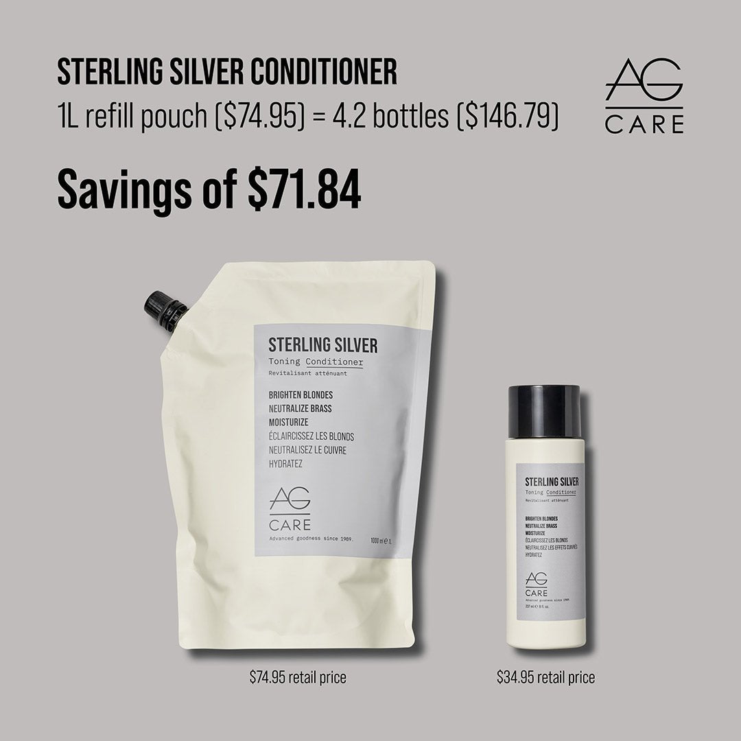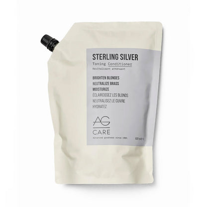 AG Care Sterling Silver Toning Conditioner 1L Refill Pouch eliminates brassy tones from blonde and silver hair. This vivid, violet conditioner infuses hair with moisture and lustre.