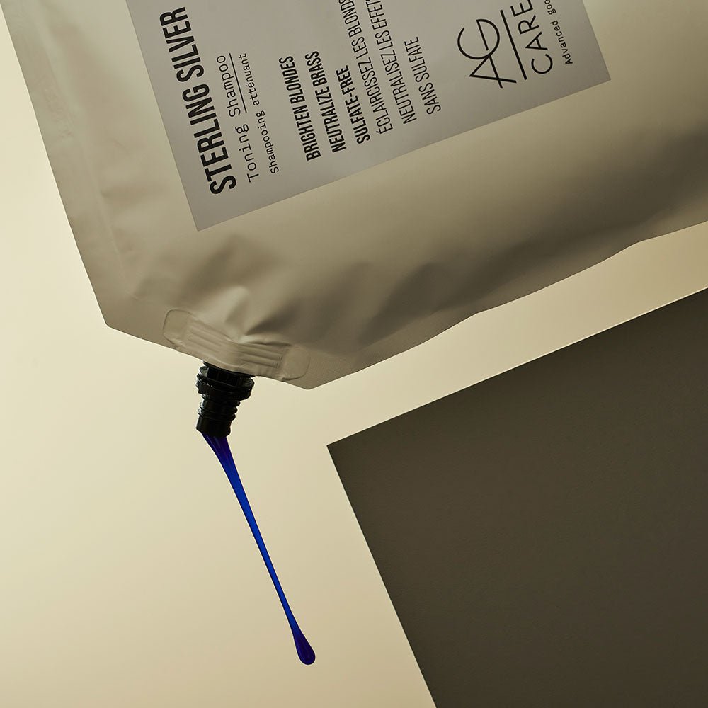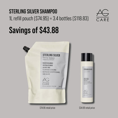 Tone your blond or silver hair with AG Care Sterling Silver Toning Shampoo 1L Refill Pouch. Our refill pouch contain vivid violet pigments that neutralize brassiness caused by sun exposure and free radicals. The result? Healthy-looking, radiant locks without unwanted yellow and orange tones.