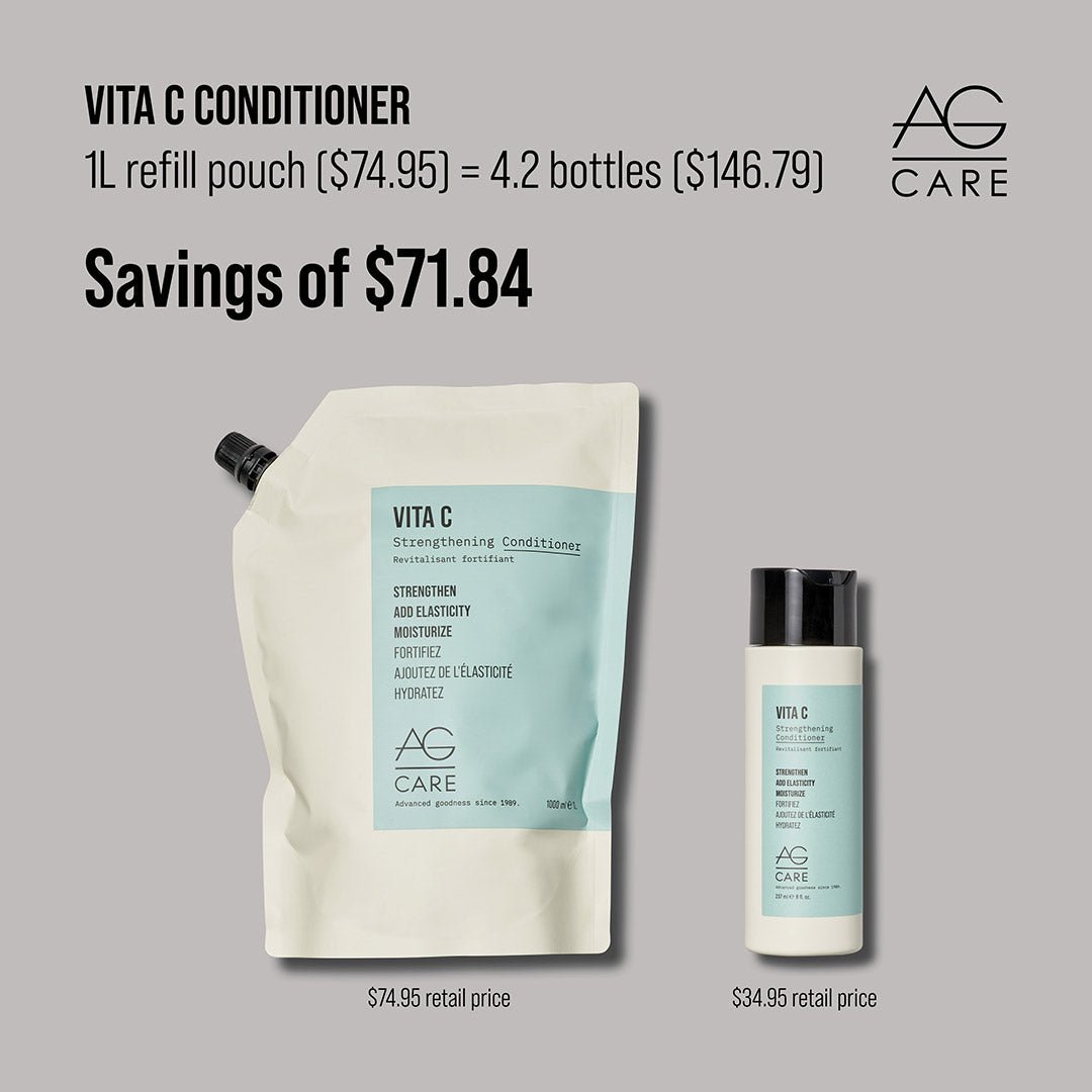AG Care Vita C Strengthening Conditioner 1L Refill Pouch is formulated to add strength and shine to hair. This nourishing, vegan conditioner contains vitamin C and plant-based squalane to help increase collagen, add elasticity and fortify the cuticle.