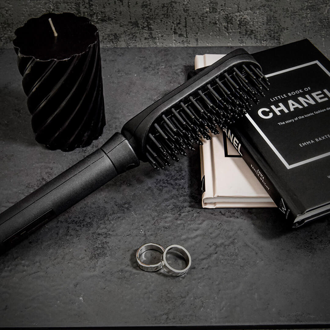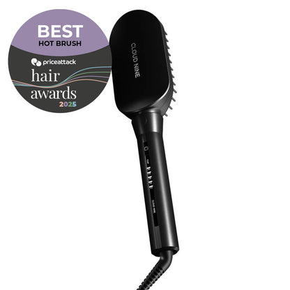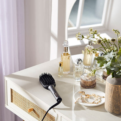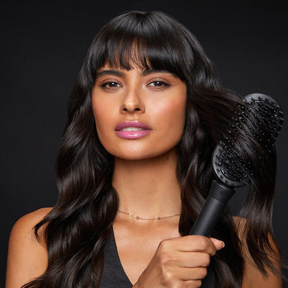 The Hot Brush refreshes second-day hair with Sericite®-infused bristles and Hair Tame Tessellation™ technology that glides through hair and distributes heat evenly between 110°C and 190°C. Ideal for quick touch-ups, it adds volume and smooths frizz while maintaining hair health.