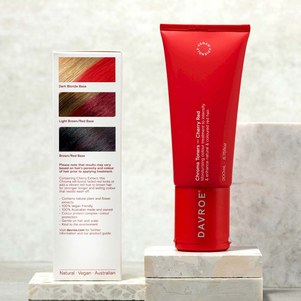 Davroe Chroma Cherry Red 200ml will re-awaken faded red hair with deep vibrant red hues. Containing Cherry Extract, this Chroma helps to retain and enhance red hair colour naturally. Colour remains vibrant and tresses are protected for shiny, healthier looking hair. Moisturising colour treatment to intensify & enhance natural & coloured red hair.