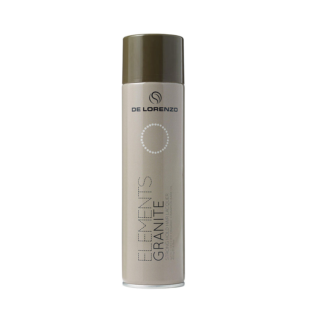De Lorenzo Elements Earth Granite is a strong hold hair lacquer designer to deliver long lasting control, shine and flexibility. Perfect for styling and finishing. Contains Organic Cinnamon Bark Oil. 400g