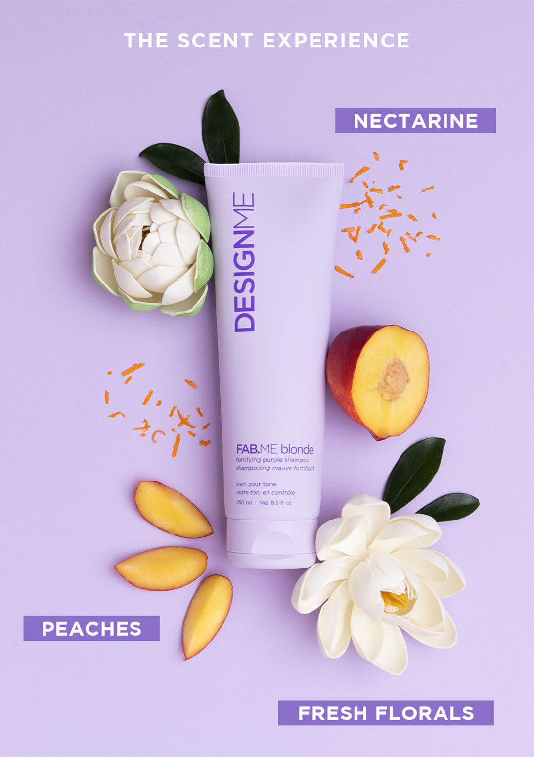 DesignMe Fab.Me Blonde Purple Shampoo 250ml features purple micro pigments that work to neutralize yellow and brassy undertones and maintain cool tones. More than a toning shampoo, this formula is packed with hydrating & plumping ingredients that gently cleanse while nourishing strands, for hair that’s brighter, stronger, and shinier from the inside out. Perfect for blonde, white & grey hair tones, whether natural or enhanced.