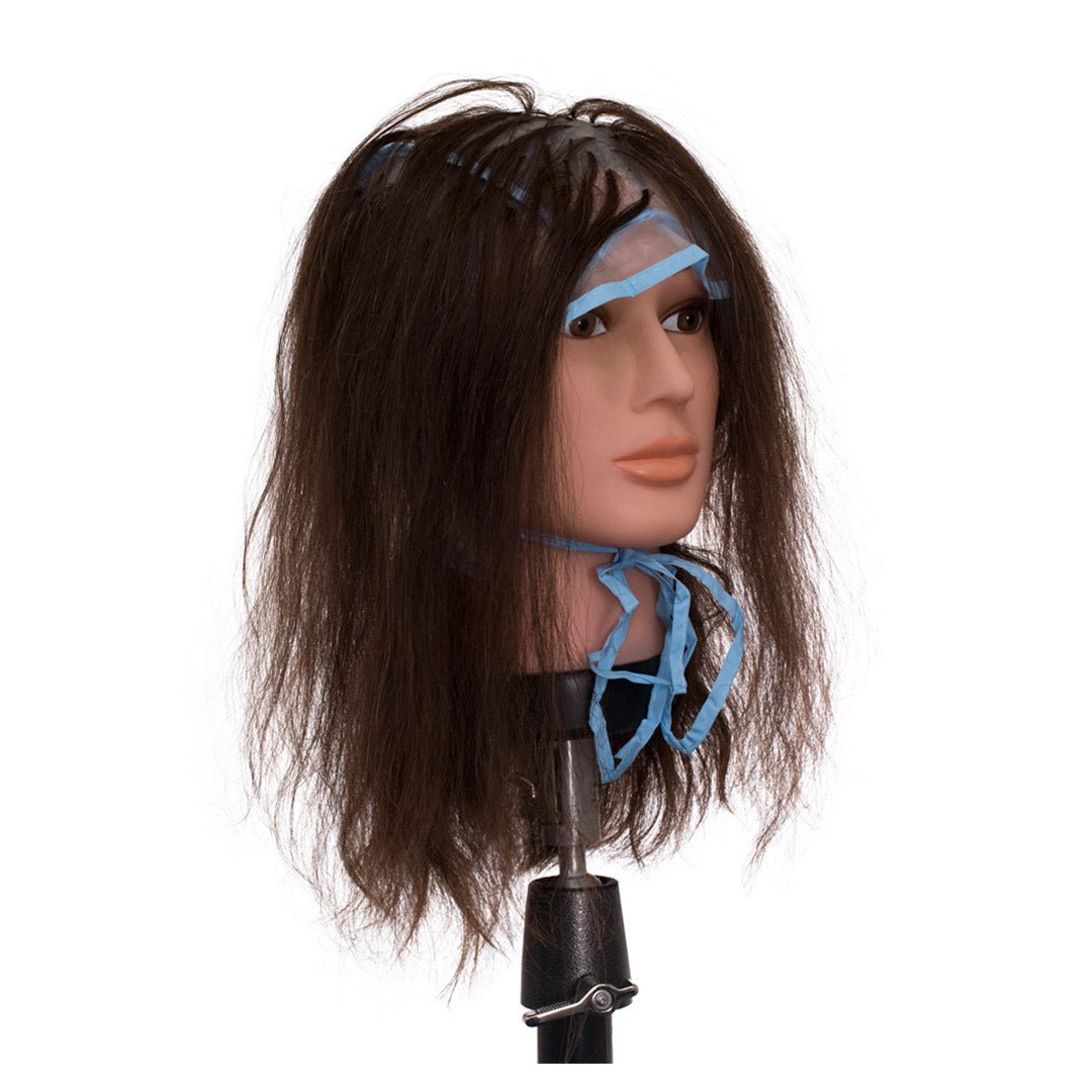 Brush hair to remove any knots. Part hair down the center, place cap onto your head and tie the blue strings under your chin. With the steel hook carefully start pulling hair through the holes. You can pull hair through every hole or you can focus on certain sections depending on the desired look. Apply product over cap. After the colour process remove cap.