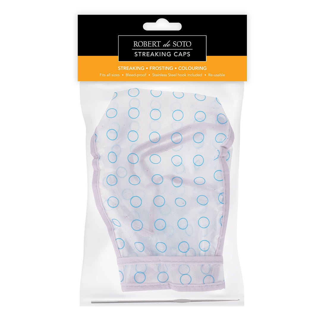 Robert de Soto Streaking Cap Disposable is ideal for salon or home use when highlighting hair. Includes a hook to pull hair through easily and purple trim border. Ideal for streaking, frosting and colouring this cap fits all sizes, is bleed proof and disposable.
