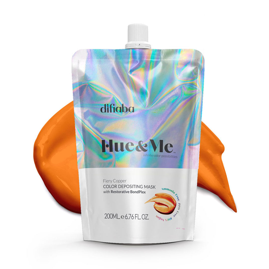 Difiaba Hue&Me Fiery Copper Color Depositing Mask 200ml formulated semi-permanent direct dye colour & deep conditioning base. Provides a revolutionary technology and creative tool, HUE & ME combines the reparative power of our *Inulin BondPlex to rebuild the internal structure of the hair with our *high definition pigments, allowing you to create infinite colour possibilities.