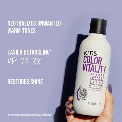 KMS Color Vitality Blonde Shampoo 300ml protects against hard water mineral accumulation & neutralizes unwanted warm tones and gently cleanses and neutralizes warm tones in blonde tones. It keeps blonde tones cool for up to 3x easier detangling.* Hydrates the hair without weight & restores shine.