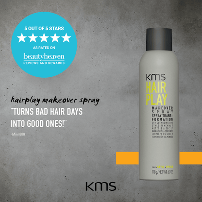 KMS Hair Play Makeover Spray dry cleanses and renews hair. A dry shampoo that absorbs oils to refresh limp or day old styles. Great for quick style touch-ups and in between shampoos.