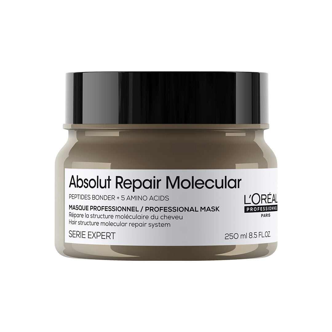 L'Oréal Professionnel Absolut Repair Molecular Mask 250ml provides a silky & creamy texture that instantly penetrates and delivers a high level of care and strength. Peptides bonder + 5 Amino acids to help rebuild hair's molecular structure. Contains fragrances of fresh salty bergamot, smoky vanilla & everlasting flower.
