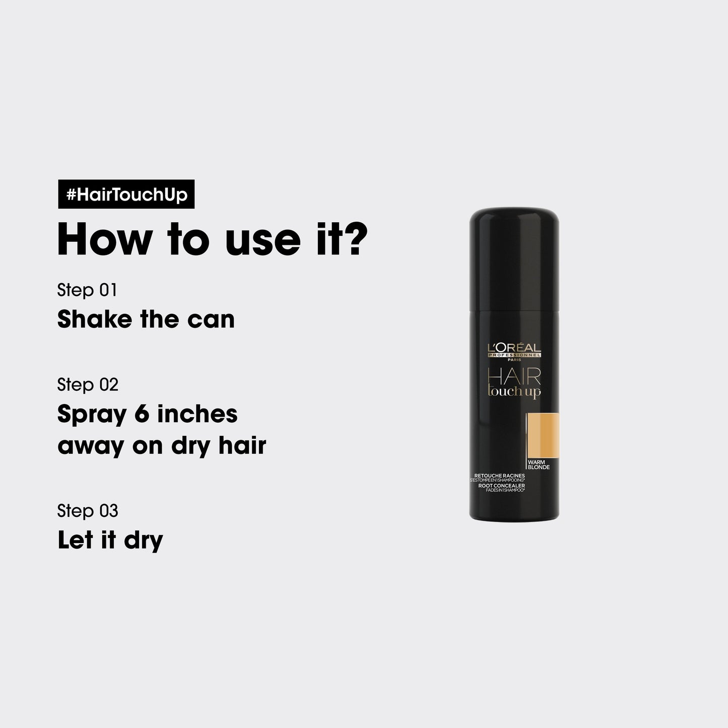L'oreal Professionnel Hair Touch Up Warm Blonde 75ml is a temporary root touch-up spray that fades in 1 shampoo. The professional pigments will get you through the last days before your next colour appointment.