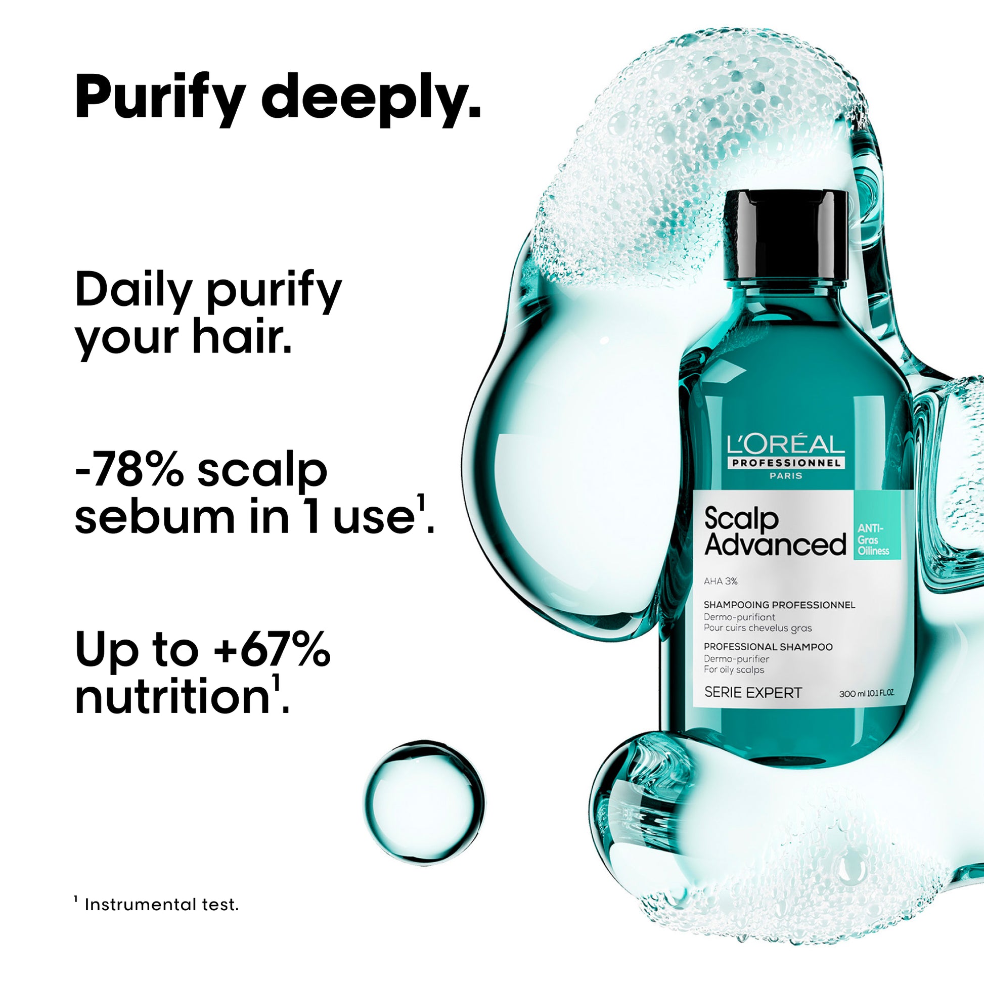 L'Oreal Professionnel Scalp Advanced Anti-Oiliness Dermo-Purifier Shampoo 300ml is a lightweight gel concentrated with AHA that purifies the scalp and hair fibers from residue, sweat and oil for a fresher and cleaner feel.