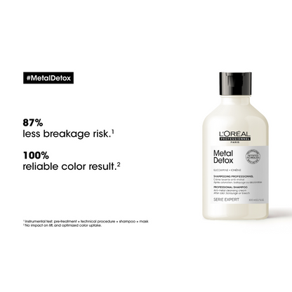 L'Oreal Professionnel Serie Expert Metal Detox Shampoo 300ml features a anti-metal cleansing cream shampoo which detoxifies hair after any colour, balayage or lightening service. Metal inside the fiber creates both a risk of breakage and negatively impacts colour results during colour, balayage and lightening services. The level of metal in hair varies, depending on hair porosity and on the water quality where we live. This internationally patented technology is enriched with Glicoamine, a molecule small enough to penetrate and neutralise metal inside the fiber.