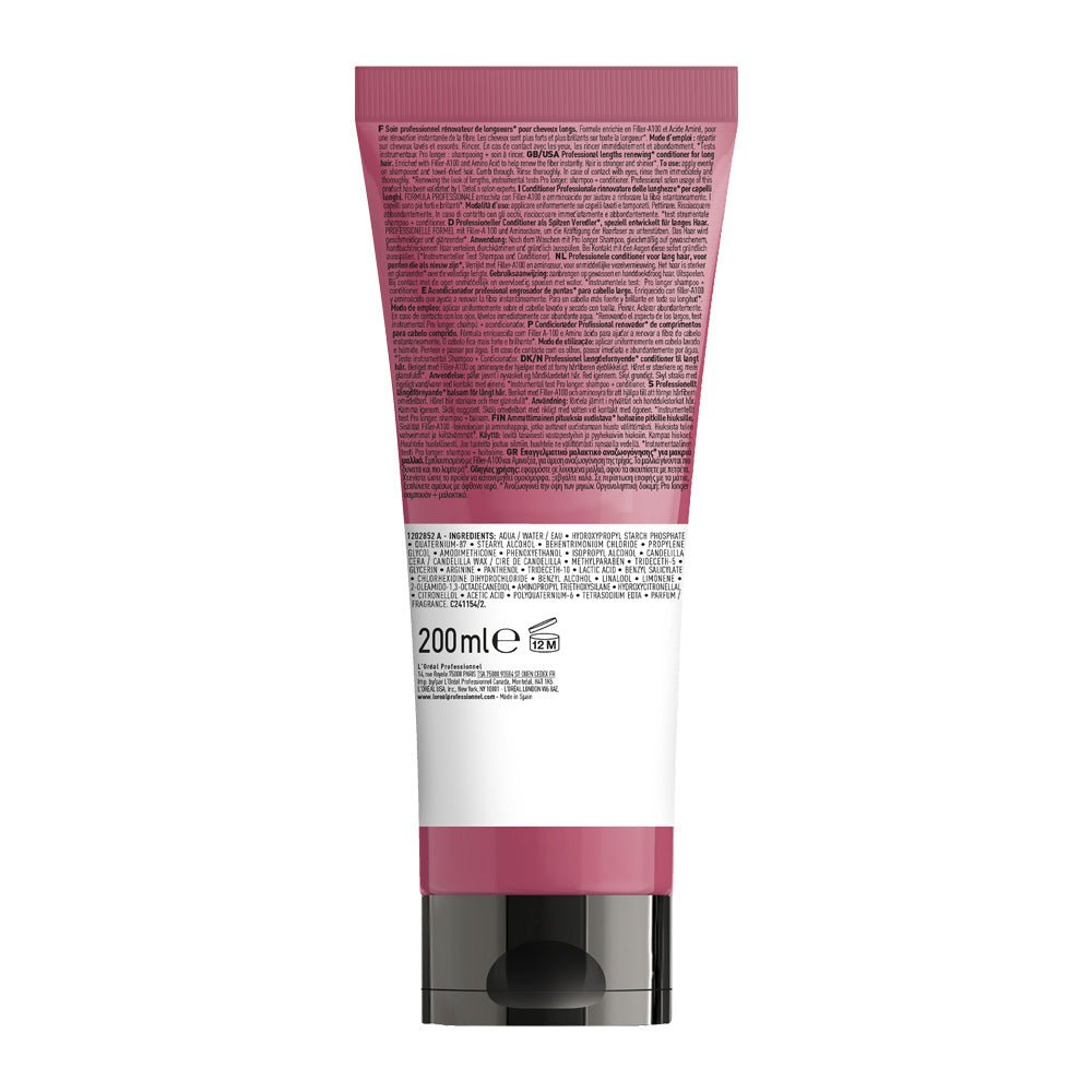 L'Oreal Professionnel's Pro Longer conditioner helps to make your long hair thicker and visibly healthier and stronger looking. When used with the Pro Longer shampoo for long hair, there is a reduction in hair breakage and split ends are visibly reduced. The unique Filler A-100 technology works by penetrating the fiber core to plump and thicken the hair from the inside. Amino acids in the formula work to strengthen the hair from the outside. The formula works on thin ends, or areas where help is most needed.