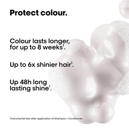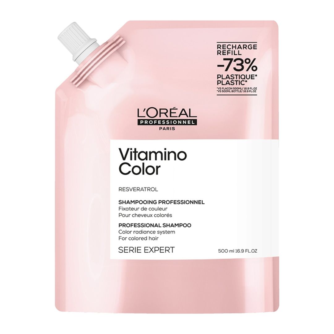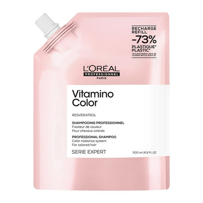 L'Oreal Professionnel Serie Expert Vitamino Color Shampoo Refill Pouch 500ml gently cleanses colour-treated hair, allowing colour to last up to 8 weeks. Coloured hair is 6 times more shiny and appears brighter and more radiant. Hair feels lighter, manageable and soft. Formula enriched with resveratrol, a powerful anti-oxydant for a perfect salon coloured hair.