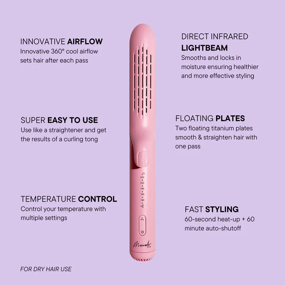 Mermade Hair Infrared Styler is a multi-functional innovative titanium flat iron that allows you to style, smooth & straighten your hair. Featuring floating titanium plates with rounded edges for even heat distribution and snag-free styling it will make styling a breeze. Adjustable temperature means you choose your preferred heat, while the fan and 360° vented airflow cool hair on contact, locking in style and shine. Infrared light beam technology locks in moisture for healthier heat styling each and every time.