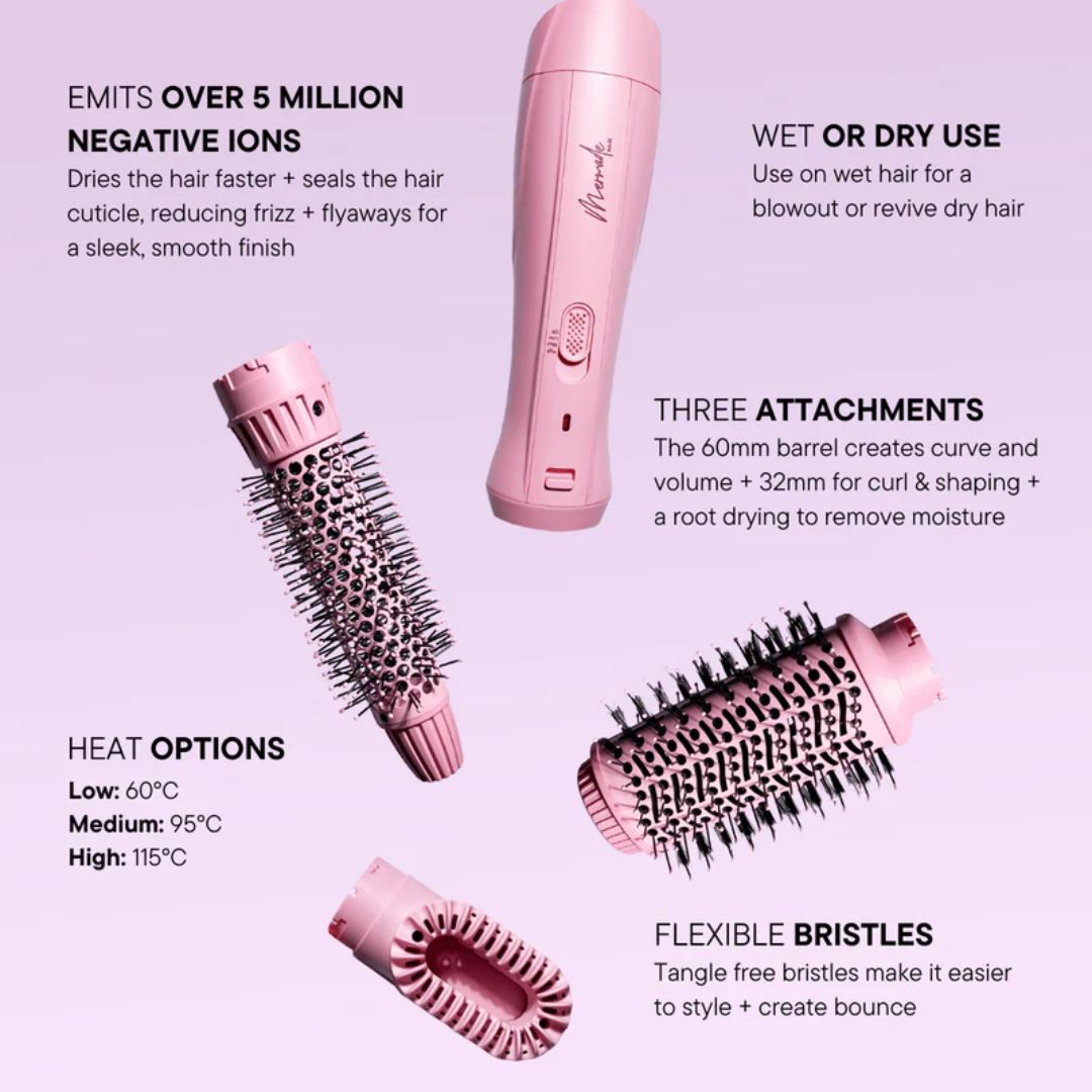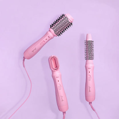 Mermade Hair Interchangeable Blow Dry Brush Pink comes with one base and three heads, you can dry, smooth and style hair with a single tool. It works like this; dry the roots and any excess water with the pre-styling dryer attachment. Then choose your fighter.