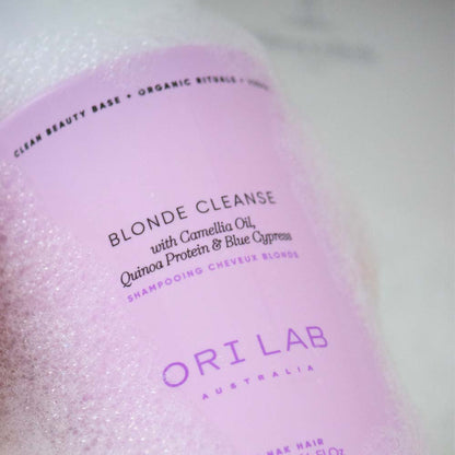 ORI Lab Blonde Cleanse 300ml brightening cleanser designed to repair, nourish and tone hair fabric. Infused with Beauty Boosters of Camellia Oil, Quinoa Protein and Blue Cypress which assist to eliminate unwanted warmth, strengthen the cuticle and add shine.