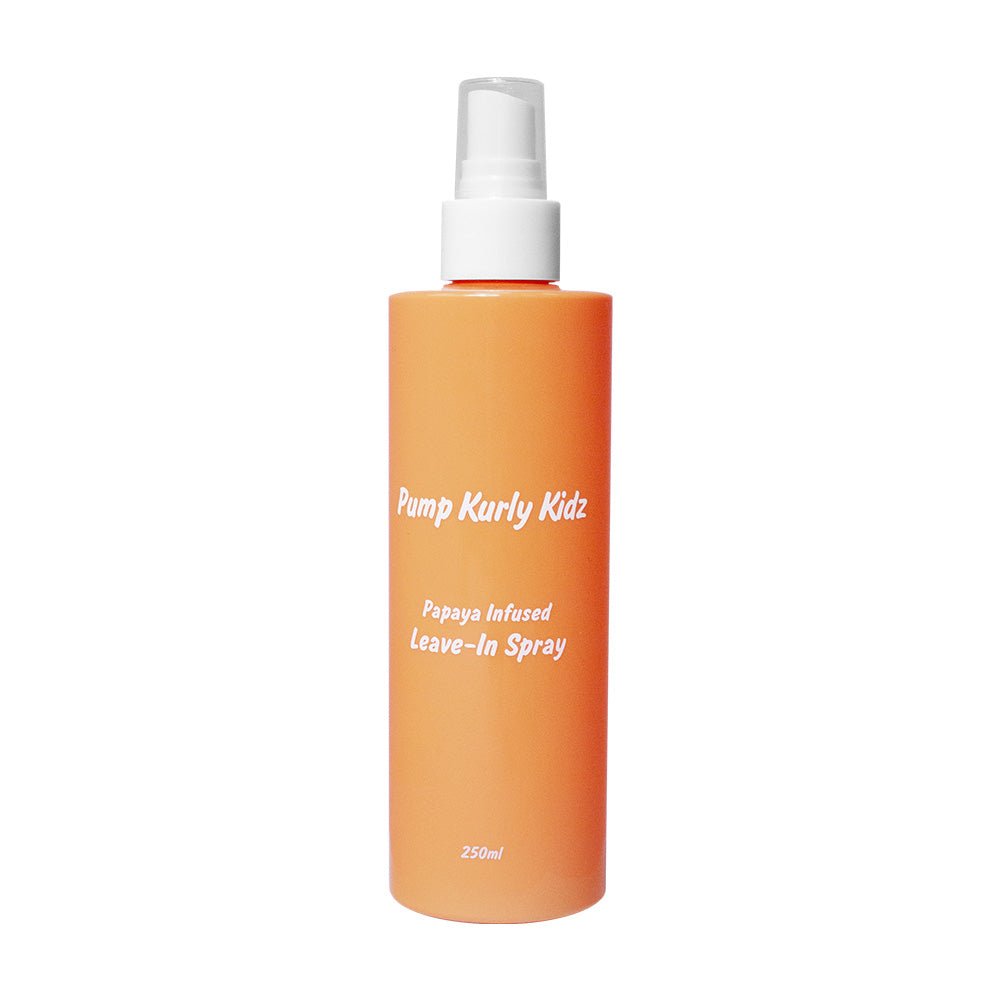 Pump Kurly Kidz Papaya Infused Leave-In Spray 250ml softens and smooths curls to remove knots and frizz. Perfect to refresh curls in between washes, or whenever they need some bounce.