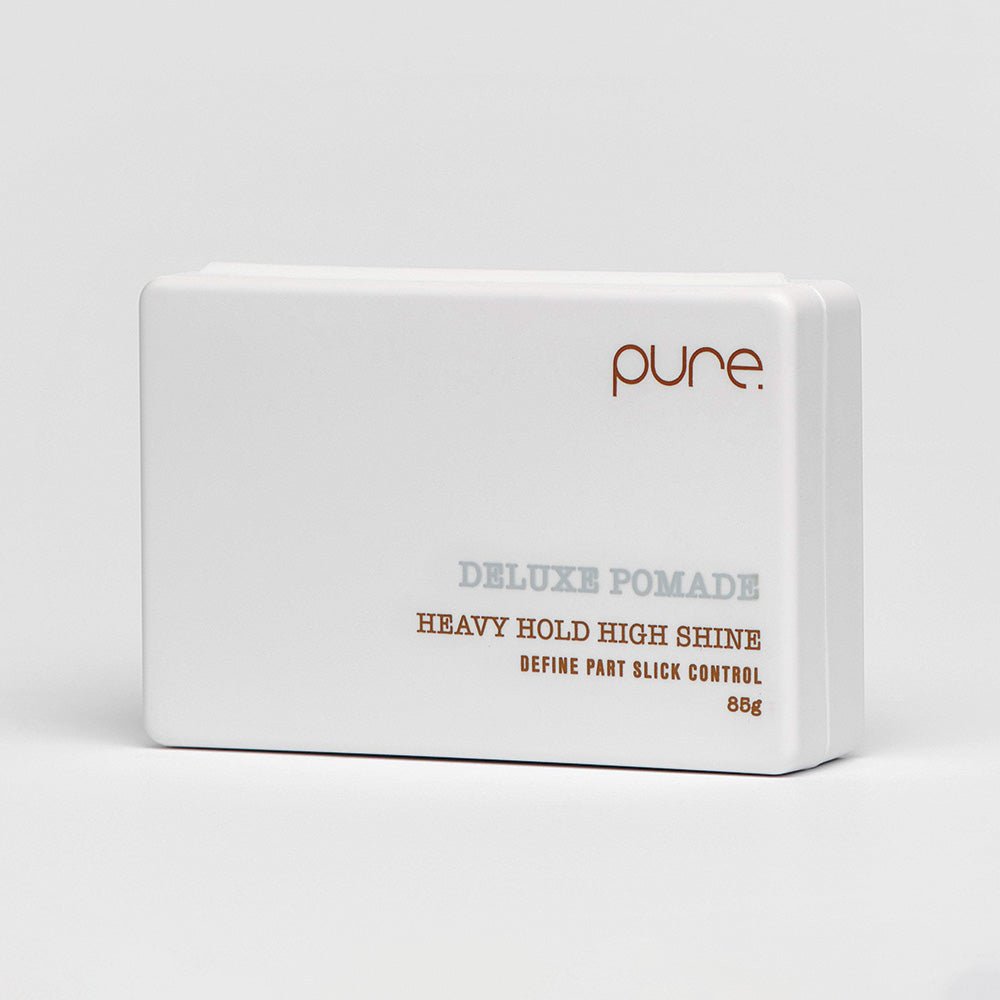 Pure Deluxe Pomade holds your style all day from root to tip, front to back with shine and control. Perfect for classic looks such as managing parts, slicking hair back or high pompadours.