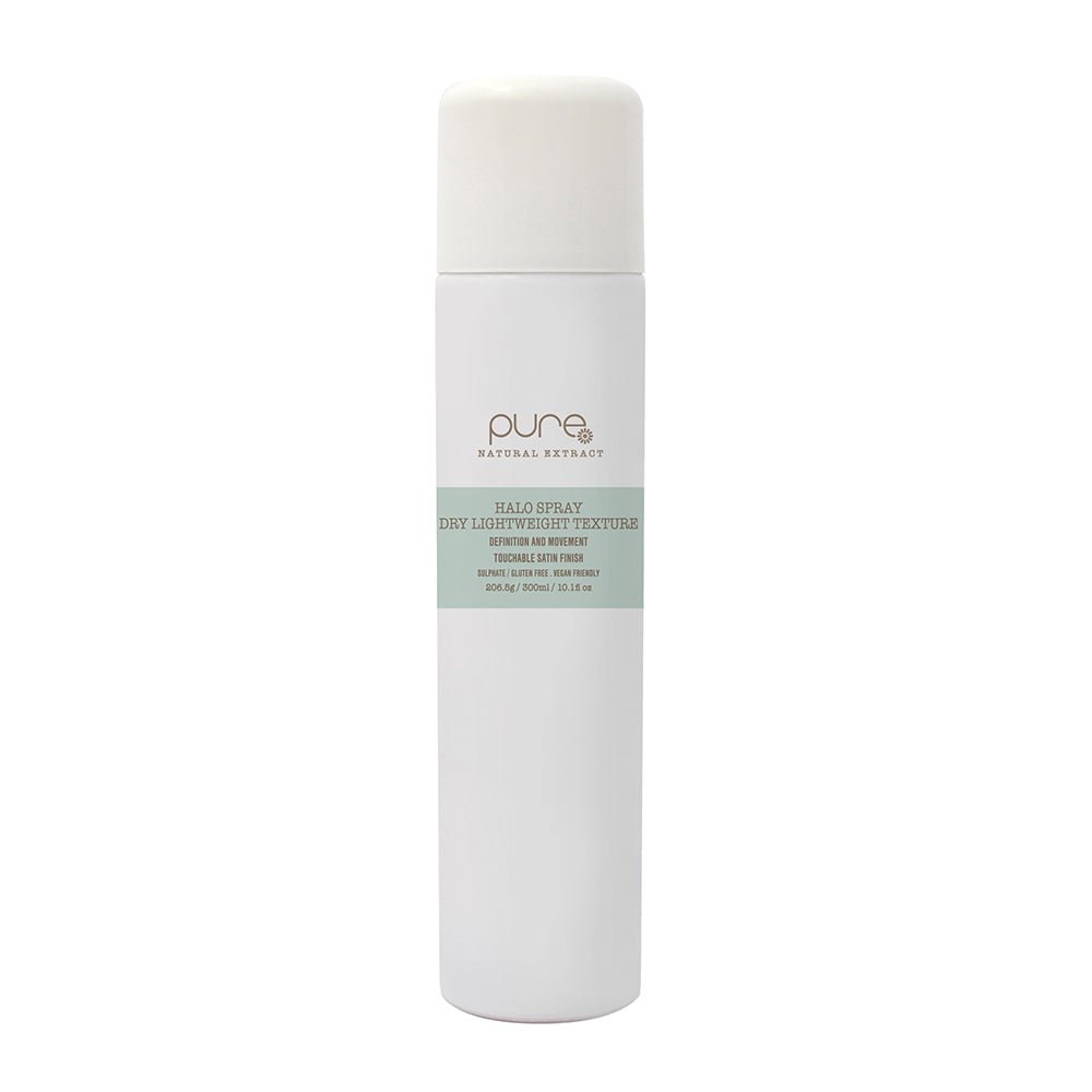 Pure Halo Spray 300ml is a medium hold dry texture spray perfect for styling hair with hot tools. It creates natural movement and definition while protecting against thermal styling and humidity.