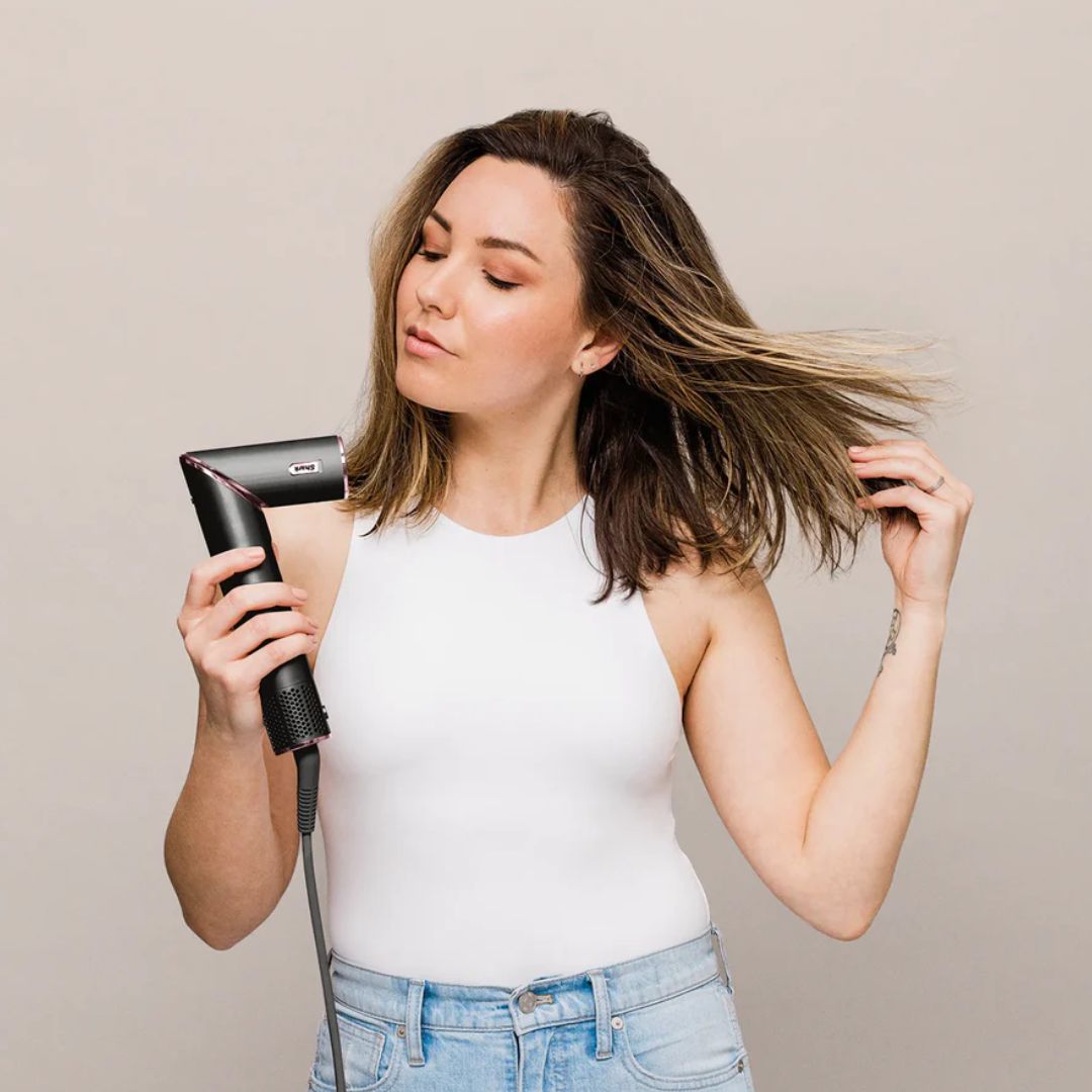 Step 5: To change from styling wand mode to hair dryer mode, slide down the lock and rotate the nozzle left. Keep rotating the nozzle until it clicks into place in hair dryer mode. To change from hair dryer mode to styling wand mode, slide down the lock and rotate the nozzle right.