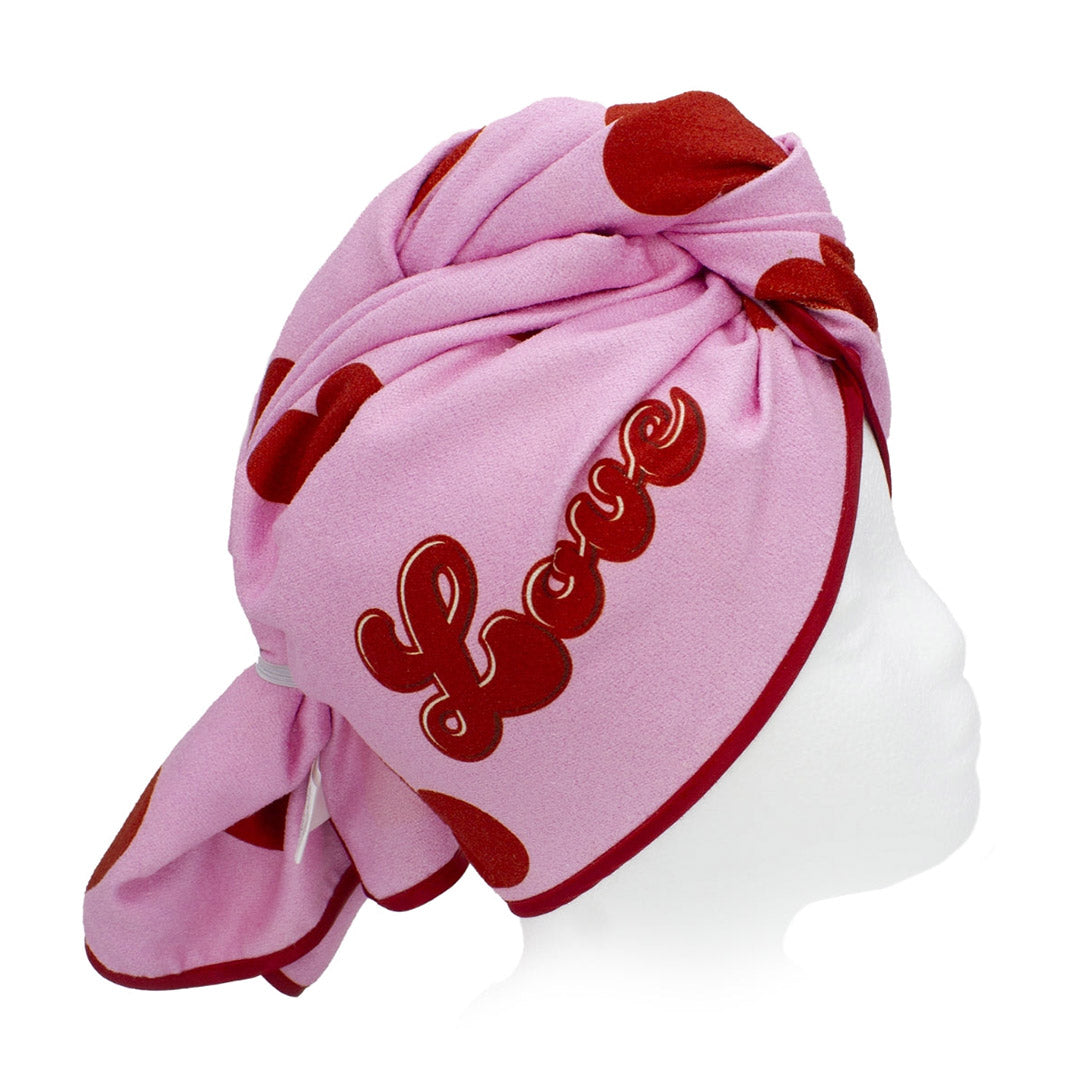 Ugly Swan Unicorn Microfibre Hair Towel Lots Of Love provides gentle fast drying of wet hair, curved back moulds to your head. Ugly Swan hair towels dry hair faster than cotton. No friction damage. Holds seven times its weight in water and stays securely on your head with its large elastic loop. One size fits all.